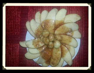Here i fancied up a simple apple by slicing it thin (yes that's only 1 apple), topping it off with caramel sauce and macadamia nuts. I also sometimes use walnuts.